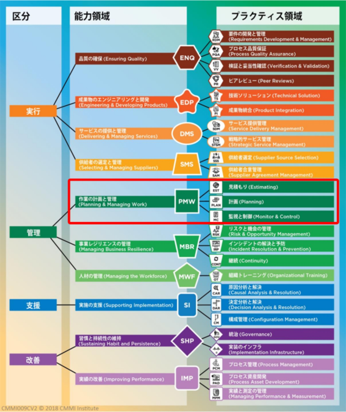 CMMI は、ソフトウェア開発プロセスの改善に役立つベストプラクティスを集めた31個のプラクティス領域で構成されます(2025年11月時点)。各プラクティス領域は、4つの区分(実行、管理、支援、改善)と、12個の能力領域(品質の確保、成果物のエンジニアリングと開発、サービスの提供と管理、供給者の選定と管理、作業の計画と管理、事業レジリエンスの管理、人材の管理、データの管理、実施の支援、セキュリティとセーフティの管理、実績の改善、習慣と持続性の維持)に分類されます。